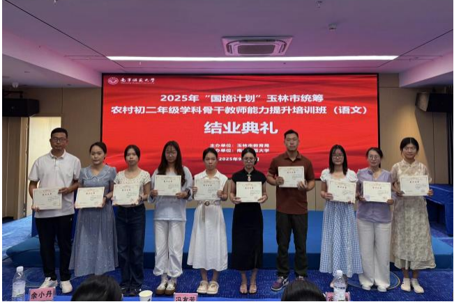 2025年9月28日上午,由玉林市教育局主办、南宁师范大学承办的2025年“国培计划”玉林市统筹项目——农村初二年级语文学科骨干教师能力提升培训班结业典礼,在南宁市迎程全智能酒店举行。教学班主任朱冬夏全程主持典礼,全体参训学员齐聚一堂,总结研修成果,为本次培训画上圆满句点。