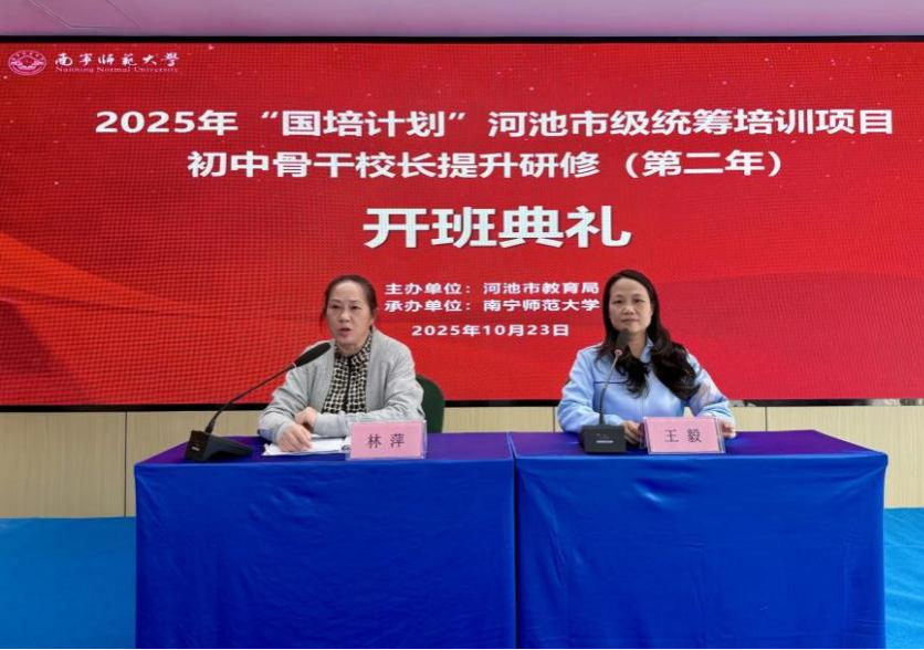 10月23日下午,开班典礼在南宁如期举行,培训班主任王毅老师与河池市教育局教师培训中心林萍主任共同出席。王毅老师简要介绍南宁师范大学办学基础,希望学员明确目标、学以致用。林萍主任对本次培训班的筹备与组织给予高度肯定,希望学员珍惜机会、发挥骨干作用。随后,周代许老师以“乡村教育振兴背景下校长专业发展与学校制度建设”开启首场专题讲座,结合案例解析实践路径。