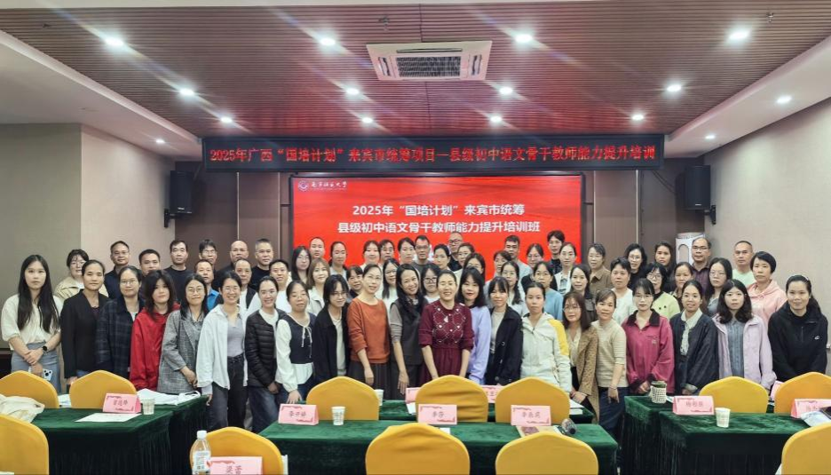 近日,南宁师范大学承办的2025年“国培计划”来宾市统筹培训项目——县级初中语文骨干教师能力提升培训班圆满落幕。本次培训为期8天,汇聚来宾市66名县级初中语文教师,通过专题授课、基地研修、实践交流等多元形式,助力教师提升专业素养与教学实践能力。