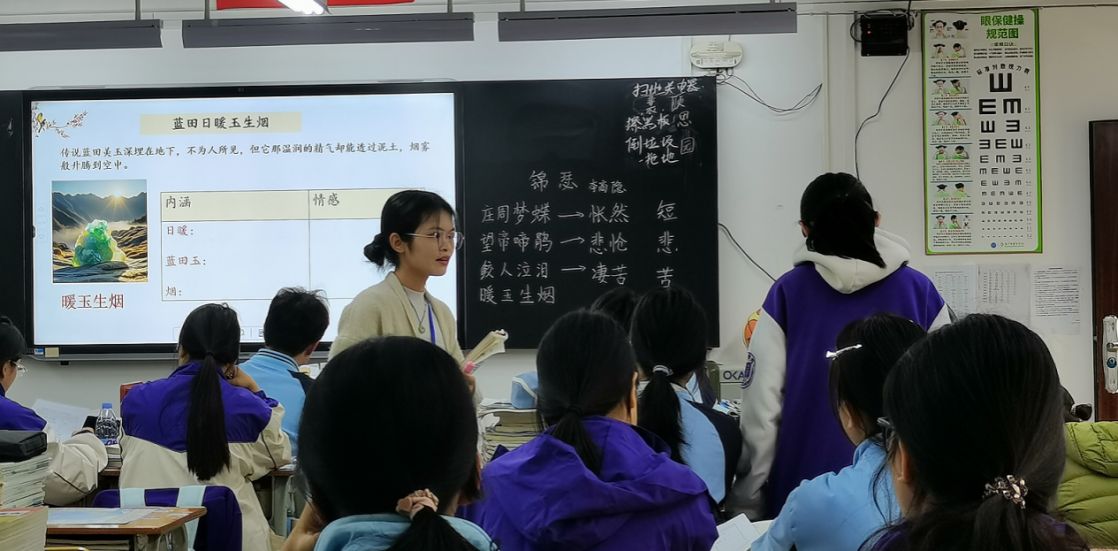 在汇报课上,实习生苏安玲为高二学生上了一节《锦瑟》诗歌鉴赏课。她教学目标明确、逻辑清晰,注重师生互动与课堂生成,展现出良好的教学素养和应变能力。