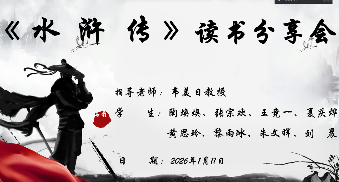2024级学科教学(语文)专业韦美日教授导师小组在腾讯会议平台召开《水浒传》读书分享会。会议以“从文本到课堂:《水浒传》整本书阅读与教学”为主题,小组成员围绕文本内容深入探讨。
