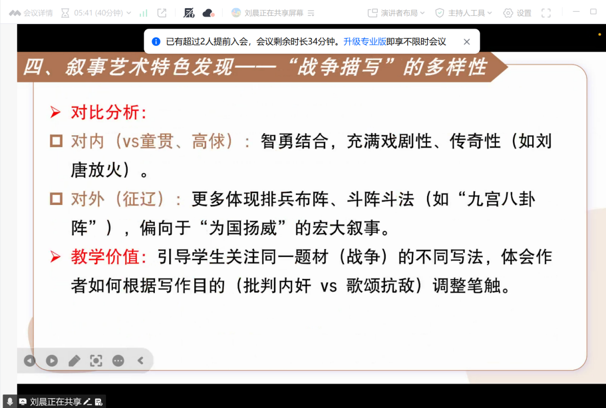 成员围绕《水浒传》展开文本分析,从故事情节、人物绰号与性格关联、主要人物形象等方面分享阅读体会。组员探讨招安后至征方腊前的关键转折段落,认为其连接梁山从反抗到效忠朝廷的转变,以此理解征方腊的悲剧性。基于阅读体会提出教学活动建议,如辩论宋江选择、描写好汉心理活动、比较写作差异等,培养学生细读文本与共情人物的能力。重点分析《林教头风雪山神庙》教学价值,从细节和整体两方面解读林冲性格转变及对“官逼民反”主题的服务。此外,延伸到古今“绿林好汉”精神比较,探讨侠义精神传承演变,强调当代兼顾正义追求与法治观念。
