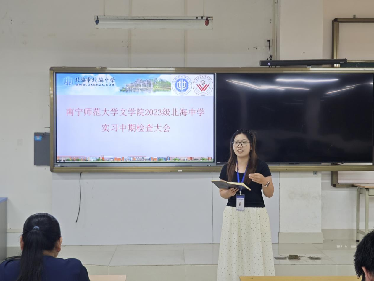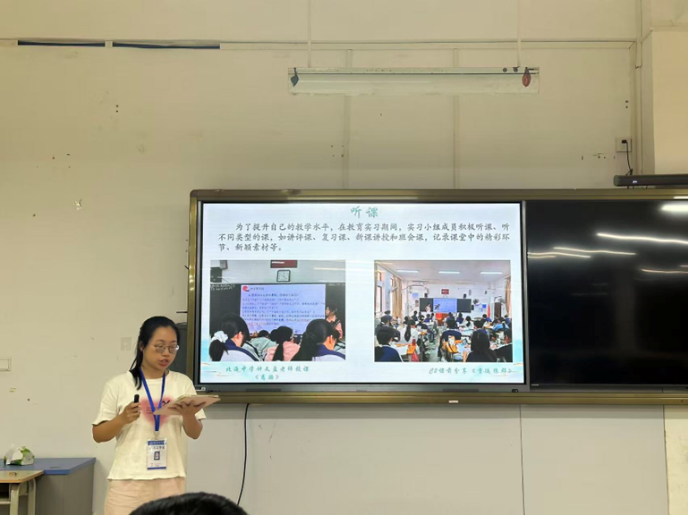 汇报课上,八个实习小组代表轮流发言,围绕课堂教学、班级管理、教研实践等方面汇报实习心得与收获。实习生代表们表示,在北海中学指导老师的悉心指导下,大家逐步熟悉高中语文教学流程,熟练掌握备课授课、作业批改、学情反馈等教学技能,沟通表达、课堂组织与班级管理能力得到显著提升,深刻体会到“课堂温度”相较于教学进度与效率更为重要。同时,实习生们也客观梳理了自身的不足,如在《祝福》等课文教学中,对学生发散性思维的引导不足、课堂突发情况应对不够从容、教学重难点把握不够精准等问题,并表示将在后续实习中认真整改、补齐短板。